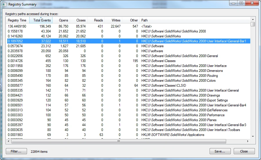 When starting SOLIDWORKS 2008, there were over 18,000 access events for the registry path: HKEY_CURRENT_USER\\Software\\SOLIDWORKS\\SOLIDWORKS 2008\\User Interface\\General-Bar1