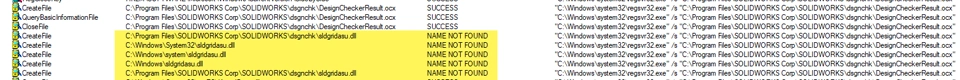 .Theorized that the command "C:\\Windows\\system32\\regsvr32.exe" /s "C:\\Program Files\\SOLIDWORKS Corp\\SOLIDWORKS\\dsgnchk\\DesignCheckerResult.ocx" failed to find C:\\Program Files\\SOLIDWORKS Corp\\SOLIDWORKS\\sldgridasu.dll, which is a dependent Dynamic-Link Library (DLL) file and this might be causing the failure.