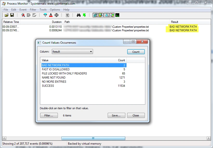 In many cases, the resulting Process Monitor log will include thousands of events even for one process. Use the Process Monitor filter to hide all of the irrelevant events in the log and focus on the events that result in ACCESS DENIED.