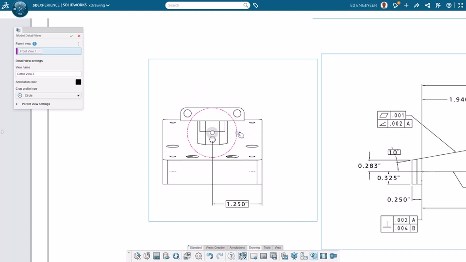 Quickly document internal features or complex areas of a design using familiar 2D drawing workflows. Create section and detail views directly from the drawings environment using traditional section lines and crop circles, which are essential cues to ensure clear interpretation of the drawing. The section lines and crop circles are automatically shown on the parent 3D views to improve model-based communication and reduce the MBD learning curve.