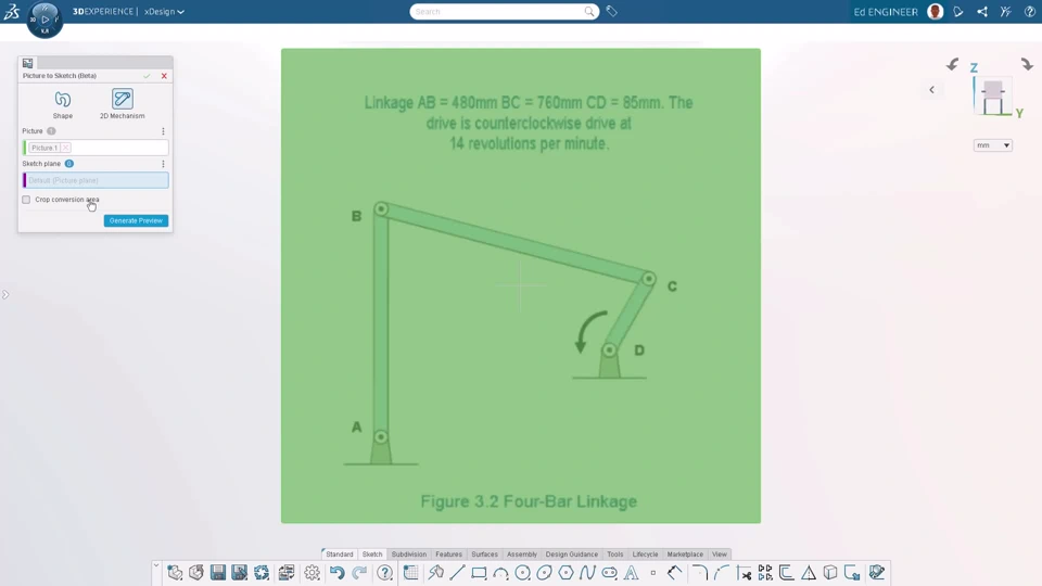 Convert an image of a mechanism into a sketch more accurately with the new 2D Mechanism option in the Picture to Sketch tool. This option has improved logic for recognizing objects (such as linkages, anchors, and rollers) and constraints (such as hinges, sliders, and anchor points) in the image, enabling automatic creation of sketch geometry and constraints.