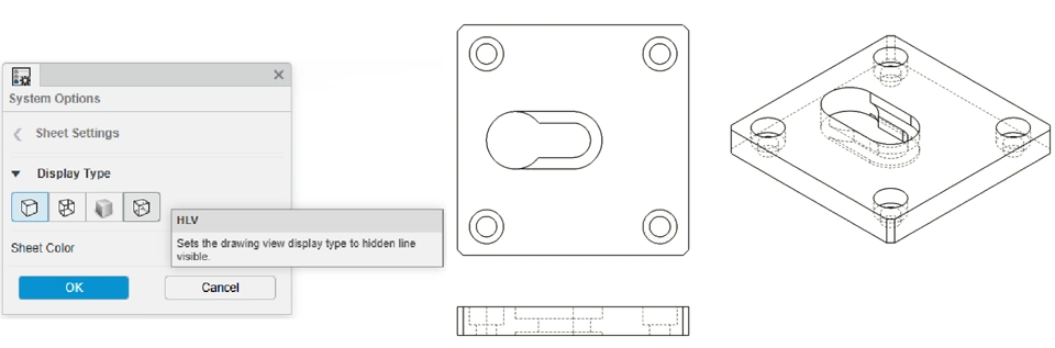 Standardize your definition and enable clear downstream communication with industry-formatted Hidden Line Visible (HLV) display for model-based and 2D drawing views. HLV is a display mode that shows the edges of features obscured from view by solid geometry as dashed lined in 3D and 2D. Simplify the drawing, while enhancing clarity, with the ability to clearly identify internal or hidden geometry without sectioning the model.