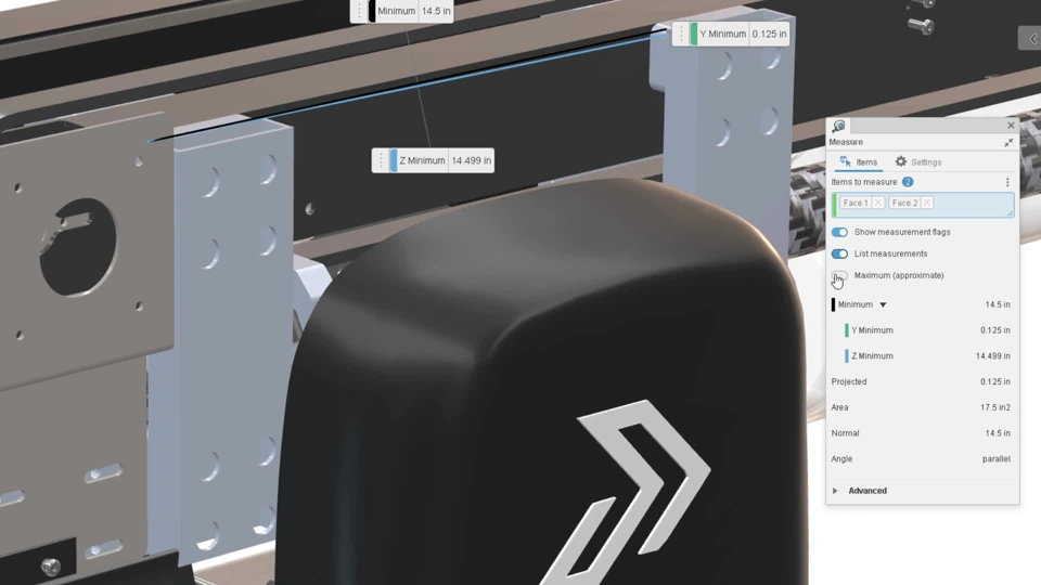 Quickly inspect and verify geometry to ensure design accuracy and intent. Enhancements to the Measure tool include the ability to hide measurement flags, view maximum dimensions, clear selections from the right-click menu, and use a new mini-dialog that is optimized for small viewports.