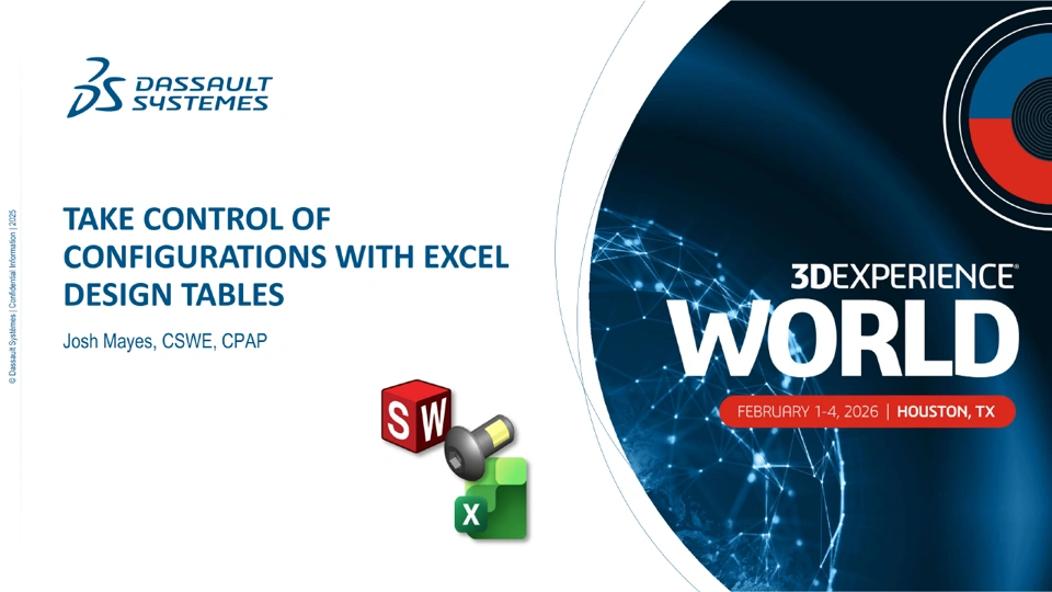 Don't let your SOLIDWORKS configurations get out of control! Ditch tedious and complicated variation management and unlock the power of Excel Design Tables! Do you want to supercharge your CAD models to do more without making them unmanageable for others? Join SOLIDWORKS Champion and User Group leader, Josh Mayes, for this engaging presentation designed to transform the way you create and manage your designs. In this session, we'll dive into the world of Design Tables, the most powerful yet often underutilized tool for automating variations of your parts and assemblies. You'll see demonstrations how to utilize embedded Excel to create and manage an entire family of parts within a single file, a far more efficient approach than using "Save As..." This workshop is for beginners to experienced professionals, who want to learn how to streamline their design process and avoid chaos when managing complex part families. Come prepared to learn and get inspired!