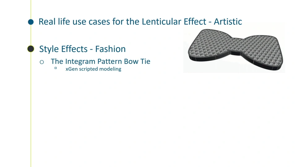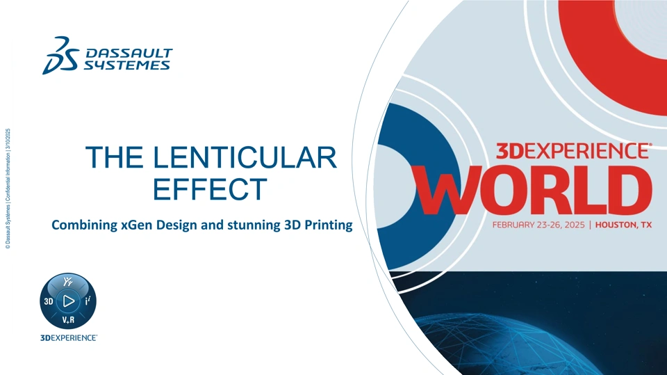 The Lenticular effect first caught my eye with a Stratasys polyjet sample part comprised of layers of patterned Clear Dome Lens 'Lenticles' with an image underneath that made the part visibly change colors when viewed at different angles. This is a modern version of the 'moving picture' effect in kids' books when sliding bars across an image revealing select parts. With awesome UX Curve mapping in xGenerative Design, the 'limitless' Sub D topology that xShape offers, and practical applications in SOLIDWORKS, we leverage crystal clear materials, millions of opaque and translucent colors, rigid and flexible polyjet printing supports. We extend this effect with complex 3D patterns and shapes to achieve amazing visual results. Moreover, the design variability of xGenerative enables infinite, easy iteration - the best of everything! We build on our research and achievements from last year to bring you the new features and processes that help us reach our goals easier and better than before!