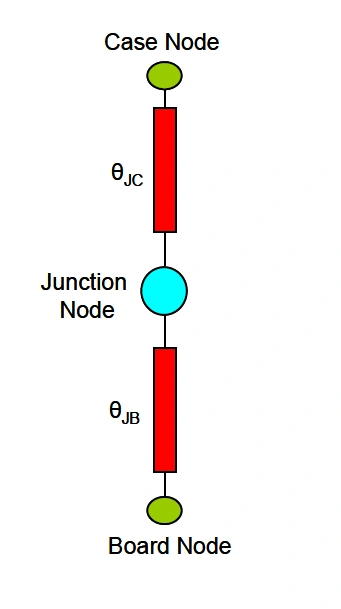 The two-resistor compact model consists of three nodes connected by two thermal resistors. These three nodes represent the measured values of the Junction-Board (⊖JB) and Junction-Case (⊖JC) resistance shown in Figure 5.