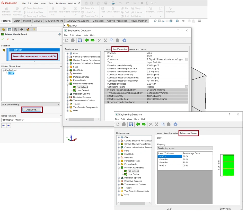In addition, users must describe the internal structure of the PCB in one of the available types, namely Conductor Volume Fraction, Board Mass and Layer Definition. For more information, see the Knowledge Base QA Article: QA00000116176 or refer to the topic “Creating a Printed Circuit Board” in the “SOLIDWORKS Flow Simulation Online User’s Guide”.