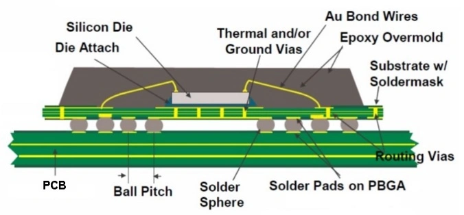 The PBGA package consists of a silicon die (chip), which is mounted on the substrate using a die attach (thermally conducting adhesive). The package substrate is a multilayer printed circuit board with metal circuit traces and through holes (routing vias) to connect the front of the laminate with the ball pads on the back side. On the top surface of the substrate, there are metal pads to which the gold wires bond. The pads on the semiconductor chip are arranged around the perimeter allowing for ease in wire bonding from the chip to the pads on the substrate. This entire integrated circuit and gold wire bond are encapsulated in a plastic mold, shown as the epoxy overmold in Figure 2