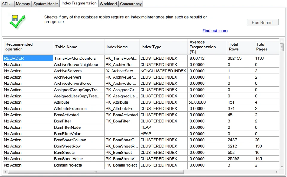 The Recommended operation column in the report states if a specific table or table index requires a specific maintenance task.