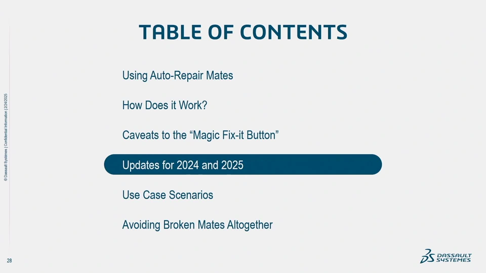 For the last three years, SOLIDWORKS has had many enhancements allowing users to automatically repair mates and now dimensions in our designs. These features can save significant time in rework. When I worked in industry, 20% of my time would have been freed with this feature. It is important to learn these features and to understand how they work so we can better utilize it in our workflows. This session will examine auto-repair features and how to use them, saving you hours on your projects.
