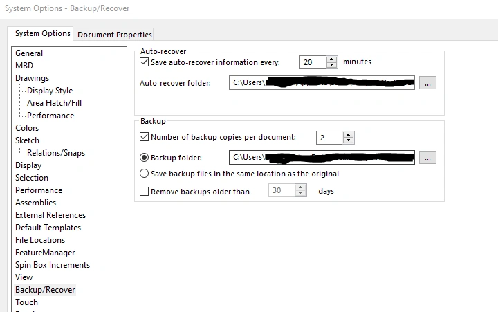 When I get started with SolidWorks after getting the system settings for the company, this is one of the first places I go to set the folders to backup and auto recover to the local hard drive. I also turn off the remove backups older than # of days. In the past I have opened files that others have modeled that did not have these settings set, and have been able to recover files that they lost.
